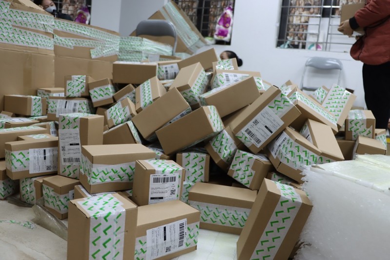 | Hàng trăm đơn hàng đã được đóng gói và dán địa chỉ chờ chuyển đến tay khách hàng |