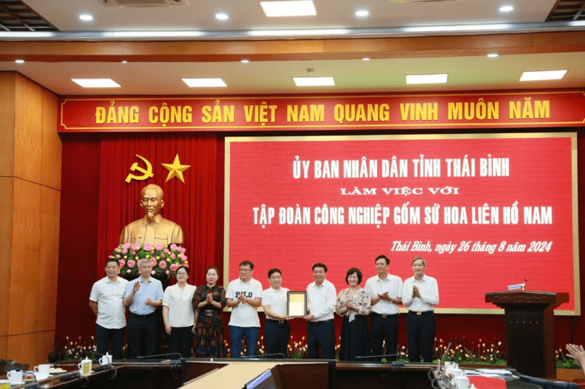 Phát biểu tại buổi làm việc, ông Nguyễn Quang Hưng, Phó Chủ tịch thường trực UBND tỉnh Thái Bình bày tỏ vui mừng được tiếp và làm việc với lãnh đạo Tập đoàn Công nghiệp gốm sứ Hoa Liên.