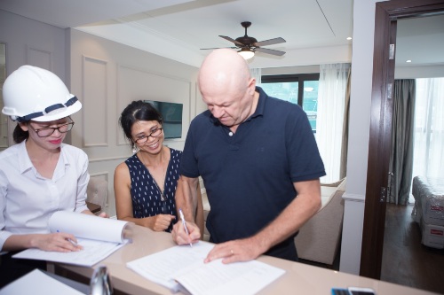 | Ông Joel J.V và bà P.N.L nhận bàn giao căn hộ 11xx sáng ngày 5/7 |