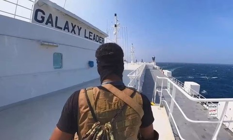 | Một chiến binh Houthi trên tàu hàng Galaxy Leader - hình ảnh do lực lượng này công bố hôm 20/11/2023 |