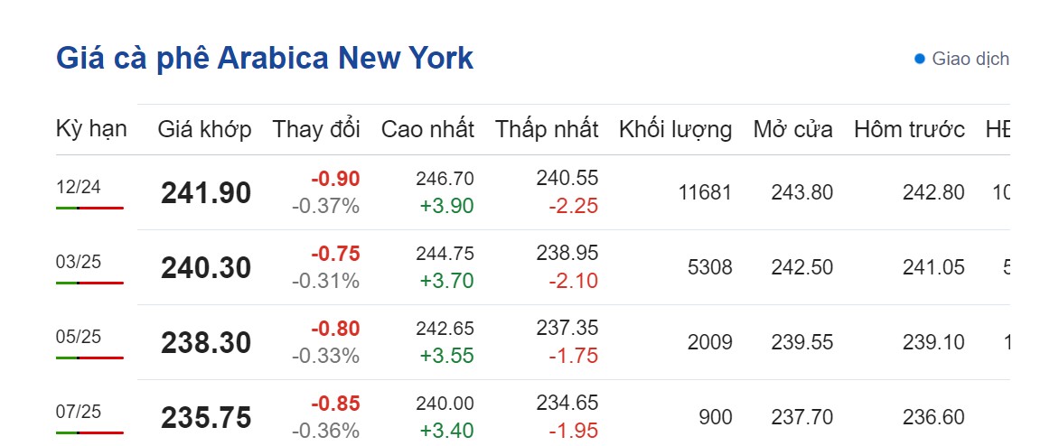 Trong đó, giá cà phê Arabica trên sàn New York hôm nay vào lúc 20h30 ngày 4/9/2024 giảm ở cả các kỳ hạn, dao động ở mức 235.75- 241.90cent/lb.