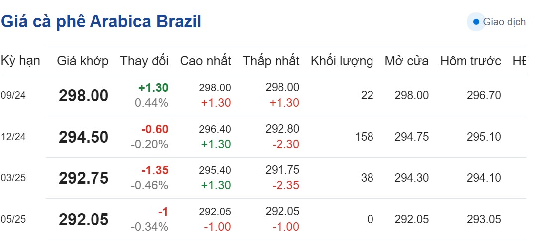 Giá cà phê Arabica Brazil hôm nay vào lúc 20h30 ngày 4/9/2024 tăng, giảm trái chiều. Cụ thể, kỳ hạn giao hàng tháng 9/2024 là 298.00 USD/tấn, tăng 0.44%; kỳ giao hàng tháng 12/2024 là 294.50 USD/tấn, giảm 0.20%; kỳ giao hàng tháng 3/2025 là 292.75 USD/tấn, giảm 0.46% và giao hàng tháng 5/2025 là 292.05USD/tấn, giảm 0.34%.