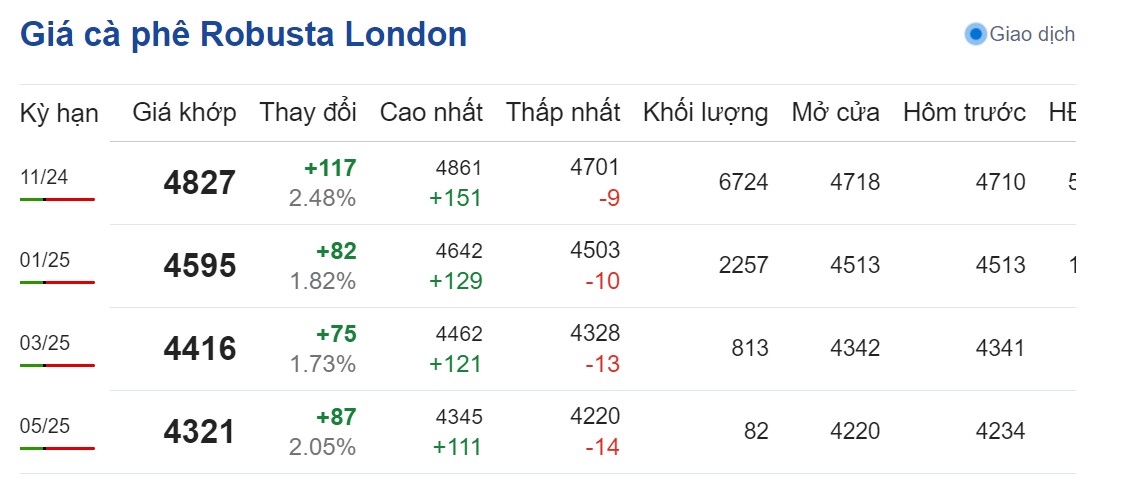 Cà phê Robusta giao dịch trên sàn ICE Futures Europe (sàn London) mở cửa lúc 16h00 và đóng cửa lúc 00h30 (hôm sau), giờ Việt Nam.