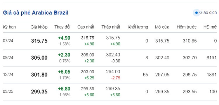 Giá cà phê Arabica Brazil hôm nay vào lúc 20h45 ngày 13/7/2024 tăng nhẹ. Cụ thể, kỳ hạn giao hàng tháng 7/2024 là 315.75 USD/tấn tăng 1.58%; kỳ giao hàng tháng 9/2024 là 305.00 USD/tấn (tăng 0.75%); kỳ giao hàng tháng 12/2024 là 301.80 USD/tấn (tăng 1.70%) và giao hàng tháng 3/2025 là 299.35 USD/tấn, tăng 1.98%.