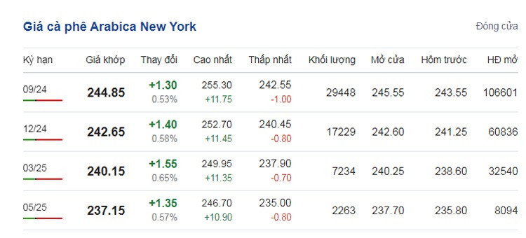 Trong đó, giá cà phê Arabica trên sàn New York hôm nay vào lúc 20h45 ngày 13/7/2024 tăng ở các cả kỳ hạn, dao động ở mức 237.15- 244.85 cent/lb.