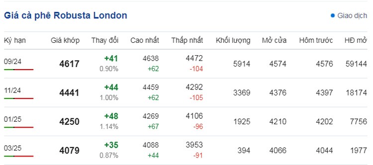 Cập nhậtgiá cà phê thế giớivào lúc 20h45 ngày 13/7/2024 theo giờ Việt Nam trên sàn giao dịch London, giá cà phê Robusta hợp đồng kỳ hạn giao tháng 9/2024 trên sàn London ở mức 4.617 USD/tấn,tăng 41 USD so với đầu phiên giao dịch. Kỳ hạn giao hàng tháng 11/2024 là 4.414 USD/tấn, tăng 44 USD; kỳ hạn giao hàng tháng 1/2025 là 4.250 USD/tấn, tăng 48 USD và kỳ hạn giao hàng tháng 3/2025 là 4.079 USD/tấn, tăng 35 USD.