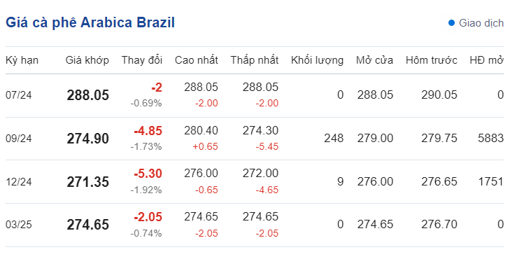 Giá cà phê Arabica Brazil vào lúc 20h20 ngày 31/5/2024 có mức giảm nhẹ ở các kỳ hạn nhưng vẫn neo ở giá cao, dao động từ 274,65 - 288,05 USD/tấn.