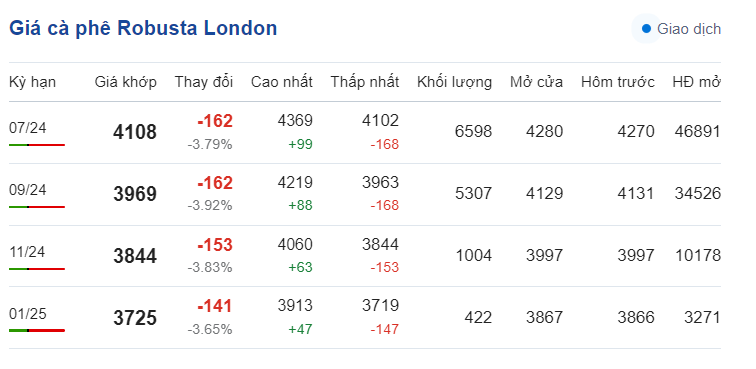 Cụ thể, giá cà phê Robusta hợp đồng kỳ hạn giao tháng 7/2024 trên sàn London ở mức 4108 USD/tấn, giảm 162 USD so với đầu phiên giao dịch. Kỳ hạn giao hàng tháng 9/2024 là 3969 USD/tấn, giảm 162 USD; kỳ hạn giao hàng tháng 11/2024 là 3844 USD/tấn, giảm 153 USD và kỳ hạn giao hàng tháng 1/2025 là 3725 USD/tấn, giảm 141 USD.