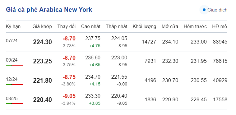 Tương tự, giá cà phê Arabica trên sàn New York hôm nay vào lúc 20h20 ngày 31/5/2024 giảm sâu ở các cả kỳ hạn, dao động ở mức 220,40 - 224,30 cent/lb.