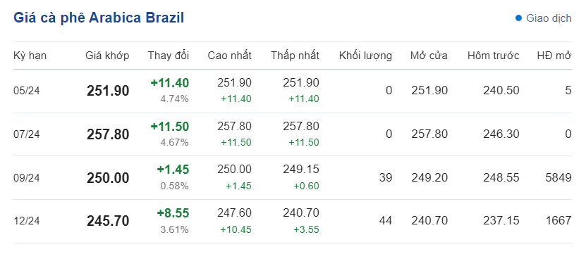 Giá cà phê Arabica Brazil vào lúc 20h30 ngày 19/5/2024 ở mức tăng kỷ lục tại các kỳ hạn giao dịch, dao động từ 245,70 - 251,90 USD/tấn.