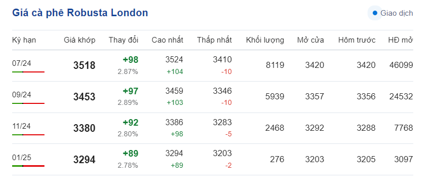 Cụ thể, giá cà phê Robusta hợp đồng kỳ hạn giao tháng 7/2024 trên sàn London ở mức 3518 USD/tấn, tăng 98 USD/tấn. Kỳ hạn giao hàng tháng 9/2024 là 3453 USD/tấn, tăng 97 USD/tấn; kỳ hạn giao hàng tháng 11/2024 là 3380 USD/tấn, tăng 92 USD và kỳ hạn giao hàng tháng 1/2025 là 3294 USD/tấn, tăng 89 USD.