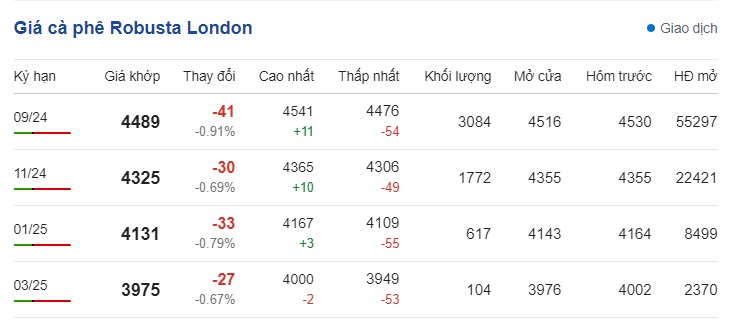 Cà phê Robusta giao dịch trên sàn ICE Futures Europe (sàn London) mở cửa lúc 16h00 và đóng cửa lúc 00h30 (hôm sau), giờ Việt Nam.