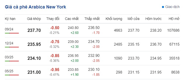 Cà phê Arabica trên sàn ICE Futures US (sàn New York) mở cửa lúc 16h15 và đóng cửa lúc 01h30 (hôm sau), giờ Việt Nam.