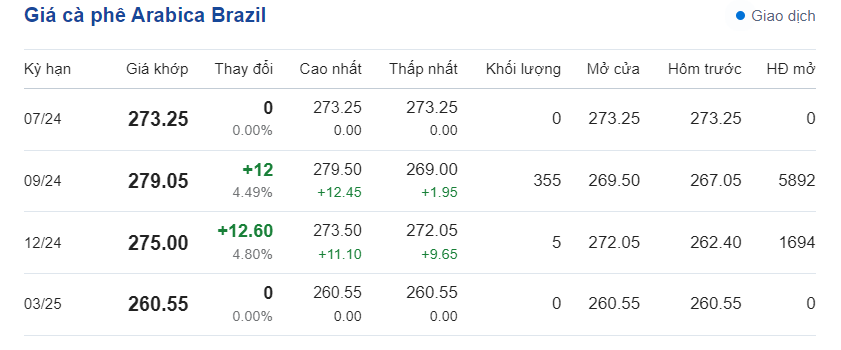 Giá cà phê Arabica Brazil vào lúc 20h20 ngày 28/5/2024 có mức tăng ở một số kỳ hạn giao dịch, dao động từ 260,55 - 273,25 USD/tấn.