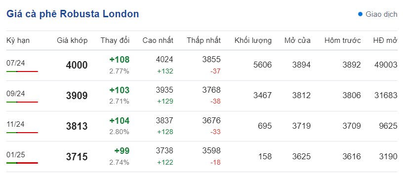 Cụ thể, giá cà phê Robusta hợp đồng kỳ hạn giao tháng 7/2024 trên sàn London ở mức 4000 USD/tấn, tăng 108 USD/tấn so với đầu phiên giao dịch. Kỳ hạn giao hàng tháng 9/2024 là 3909 USD/tấn, tăng 103 USD; kỳ hạn giao hàng tháng 11/2024 là 3813 USD/tấn, tăng 104 USD và kỳ hạn giao hàng tháng 1/2025 là 3715 USD/tấn, tăng 99 USD.