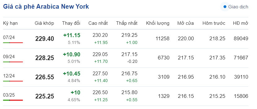 Tương tự, giá cà phê Arabica trên sàn New York hôm nay vào lúc 20h20 ngày 28/5/2024 tiếp tục tăng mạnh ở tất cả kỳ hạn, dao động ở mức 225,25 - 229,40 cent/lb.