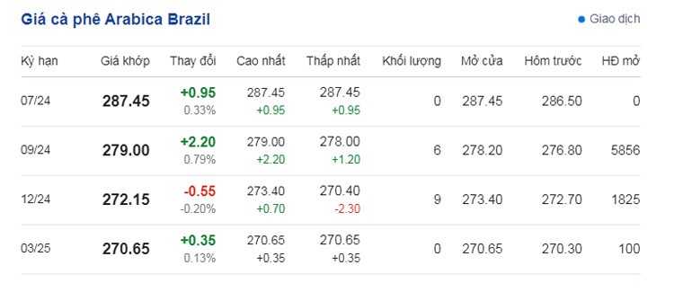 Giá cà phê Arabica Brazil hôm nay vào lúc 20h30 ngày 29/6/2024 biến động trái chiều. Cụ thể, kỳ hạn giao hàng tháng 7/2024 là 287.45 USD/tấn, tăng 0.33%; kỳ giao hàng tháng 9/2024 là 279.00 USD/tấnăng (tăng 0.79 %); kỳ giao hàng tháng 12/2024 là 272.15 USD/tấn (giảm 0.20%) và giao hàng tháng 3/2025 là 270.65 USD/tấn, tăng 0.35%.