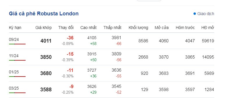 Cập nhậtgiá cà phê thế giới vào lúc 20h30 ngày 29/6/2024 theo giờ Việt Nam trên sàn giao dịch London, giá cà phê Robusta hợp đồng kỳ hạn giao tháng 9/2024 trên sàn London ở mức 4.011 USD/tấn, giảm 36 USD so với đầu phiên giao dịch. Kỳ hạn giao hàng tháng 11/2024 là 3.850 USD/tấn, giảm 15 USD; kỳ hạn giao hàng tháng 1/2025 là 3.680 USD/tấn, giảm 11 USD và kỳ hạn giao hàng tháng 3/2025 là 3.588 USD/tấn, giảm 9 USD.