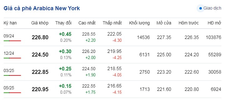 Cà phê Arabica trên sàn ICE Futures US (sàn New York) mở cửa lúc 16h15 và đóng cửa lúc 01h30 (hôm sau), giờ Việt Nam.