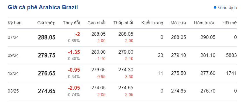 Giá cà phê Arabica Brazil vào lúc 20h20 ngày 30/5/2024 có mức giảm nhẹ ở các kỳ hạn nhưng vẫn neo ở giá cao, dao động từ 274,65 - 288,05 USD/tấn.