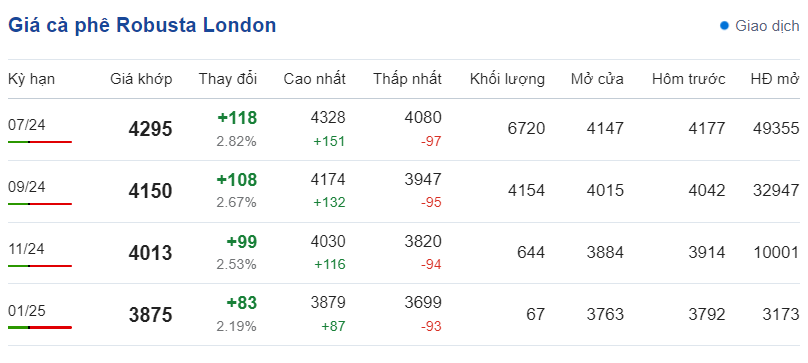 Cụ thể, giá cà phê Robusta hợp đồng kỳ hạn giao tháng 7/2024 trên sàn London ở mức 4295 USD/tấn, tăng 118 USD/tấn so với đầu phiên giao dịch. Kỳ hạn giao hàng tháng 9/2024 là 4150 USD/tấn, tăng 108 USD; kỳ hạn giao hàng tháng 11/2024 là 4013 USD/tấn, tăng 99 USD và kỳ hạn giao hàng tháng 1/2025 là 3875 USD/tấn, tăng 83 USD.