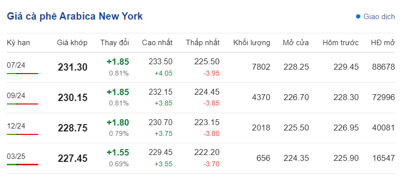 Cà phê Arabica trên sàn ICE Futures US (sàn New York) mở cửa lúc 16:15 và đóng cửa lúc 01:30 (hôm sau), giờ Việt Nam.