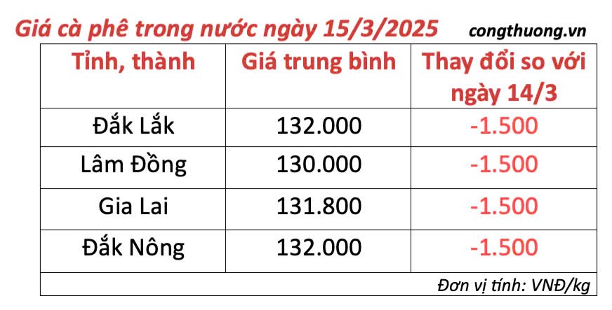 | Bảng giá cà phê trong nước cập nhật chiều ngày 15/3/2025 |