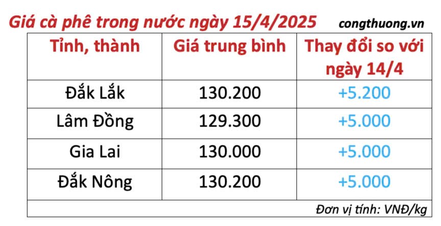 Theo thông tin từ Giacaphe.com, vào lúc 16 giờ 00 phút hôm nay 15/4/2025, giá cà phê khu vực Tây Nguyên bất ngờ tăng mạnh so với phiên giao dịch hôm qua, mức tăng từ 5.000 - 5.200 đồng/kg. Hiện giá thu mua trung bình ở mức 130.100 đồng/kg.