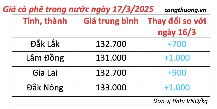 | Bảng giá cà phê trong nước cập nhật chiều ngày 17/3/2025 |