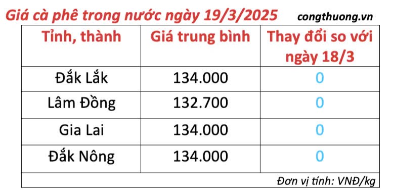 | Bảng giá cà phê trong nước cập nhật chiều ngày 19/3/2025 |