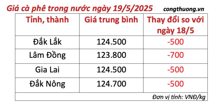 | Bảng giá cà phê trong nước cập nhật chiều ngày 19/5/2025 |