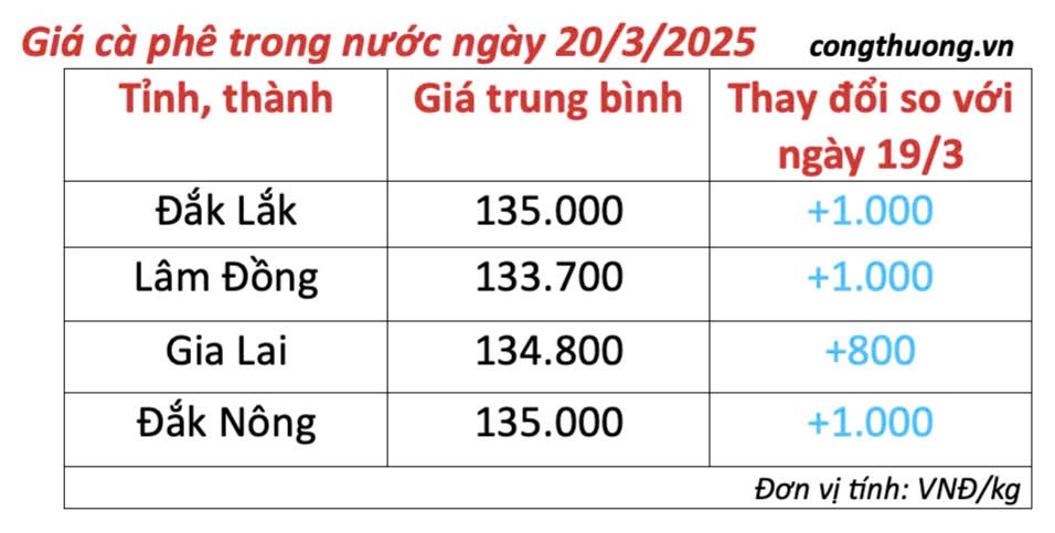 | Bảng giá cà phê trong nước cập nhật chiều ngày 20/3/2025 |