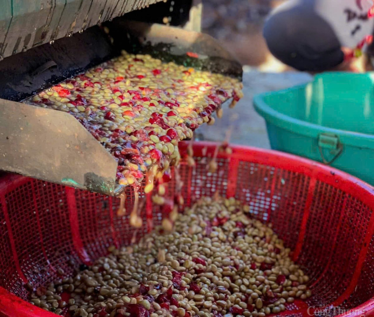 | Người dân dùng máy tách vỏ để lấy cà phê nhân tại Gia Lai. Ảnh: Hiền Mai |