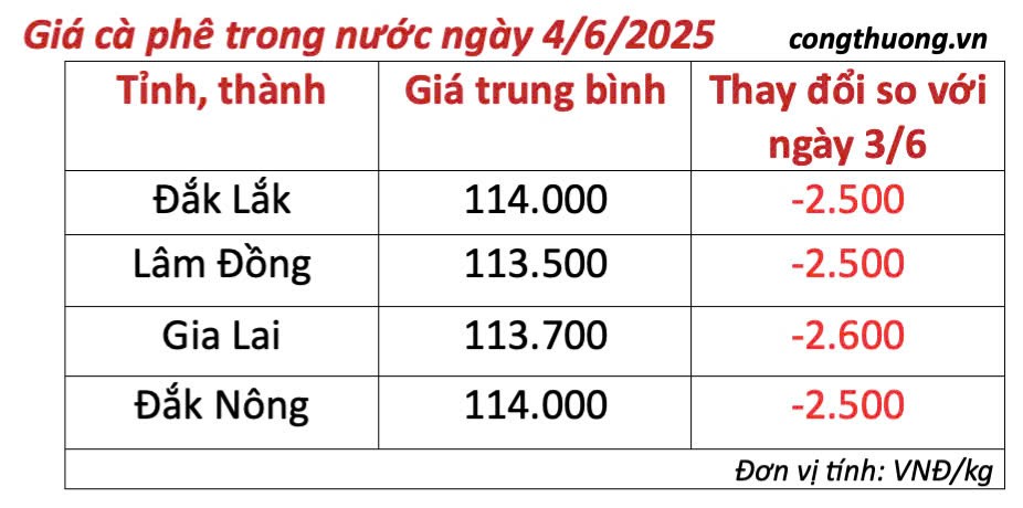 | Bảng giá cà phê trong nước cập nhật chiều ngày 4/6/2025 |