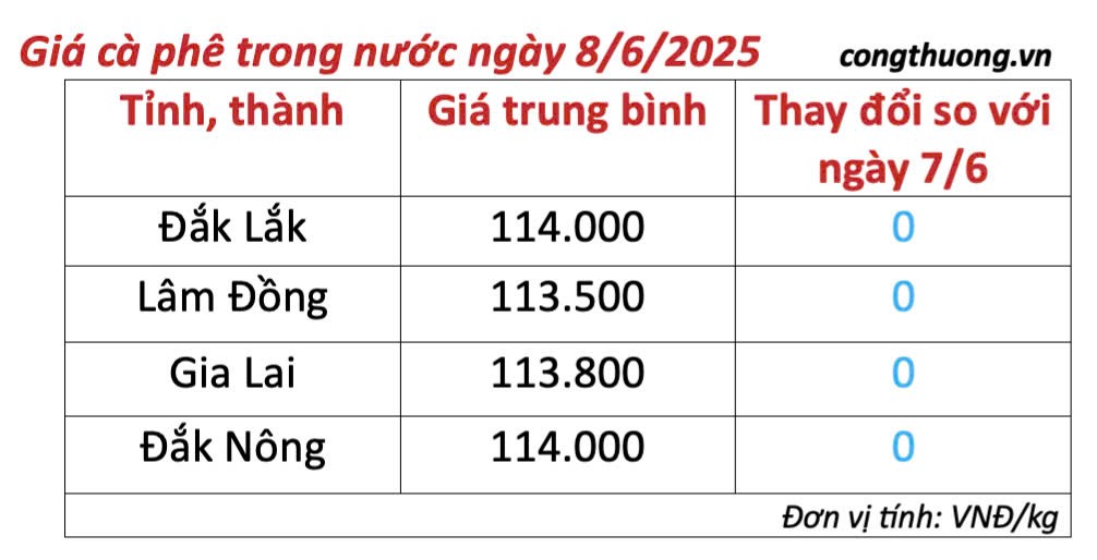 | Bảng giá cà phê trong nước cập nhật chiều ngày 8/6/2025 |