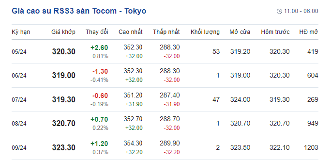 Cụ thể, giá cao su RSS3 hợp đồng kỳ hạn giao tháng 5/2024 giữ nguyên ở mức 320,3 JPY/kg, tăng 0,81%, tương đương tăng 2,6 JPY/kg so với cuối phiên liền trước. Kỳ hạn giao hàng tháng 6/2024 là 319 JPY/kg, giảm 0,41%. Kỳ hạn giao hàng tháng 7/2024 là 319,3 JPY/kg, giảm 0,19%. Kỳ hạn giao hàng tháng 8/2024 là 320,7 JPY/tấn, tăng 0,22%. Kỳ hạn giao hàng tháng 9/2024 là 323,3 JPY/kg, tăng 0,37%
