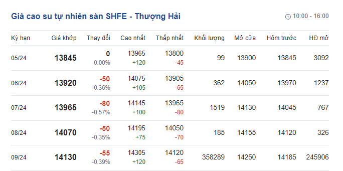 Tương tự, giá cao su tự nhiên Sàn giao dịch hàng hóa tương lai Thượng Hải (SHFE) cũng có mức giảm ở các kỳ hạn, dao động từ 13.845 - 14.130 CNY/tấn.