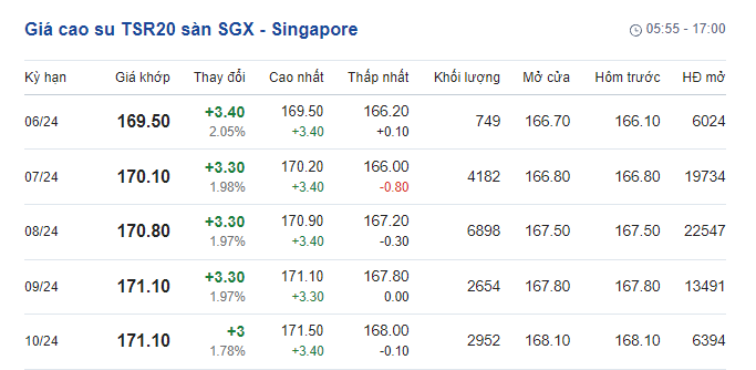 Theo đó, giá cao su giao kỳ hạn tháng 6/2024 tăng mạnh 2,05% lên mức 169,5 US cent/kg so với cuối phiên liền trước. Kỳ hạn giao hàng tháng 7/2024 là 170,10 US cent/kg, tăng 1,98%. Kỳ hạn giao hàng tháng 8/2024 là 170,8 US cent/kg, tăng 1,97%. Kỳ hạn giao hàng tháng 9/2024 là 170.1 US cent/kg tăng 1,97%. Kỳ hạn giao hàng tháng 10/2024 là 171.1 US cent/kg tăng 1,78%.
