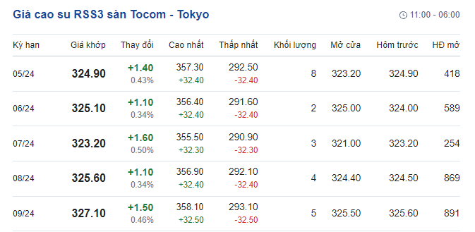 Cụ thể, giá cao su RSS3 hợp đồng kỳ hạn giao tháng 5/2024 ở mức 324,9 JPY/kg, tăng 0,43%, tương đương tăng 1,4 JPY/kg so với cuối phiên liền trước. Kỳ hạn giao hàng tháng 6/2024 là 325,1 JPY/kg, tăng 0,34%. Kỳ hạn giao hàng tháng 7/2024 là 323,2 JPY/kg, tăng 0,50%. Kỳ hạn giao hàng tháng 8/2024 là 325,6 JPY/tấn, tăng 0,34%. Kỳ hạn giao hàng tháng 9/2024 là 327,1 JPY/kg, tăng 0,46%.