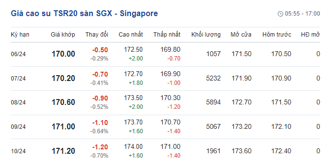 Trái ngược diễn biến trên, giá cao su TSR20 tại Sở Giao dịch Singapore (SGX) đồng loạt "chuyển đỏ", dao động ở mức 170,0 - 170,6 US cent/kg.