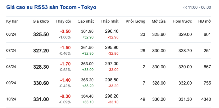 Cao su RSS3 giao dịch trên sàn Tocom - Tokyo từ 11h00 đến 17h15, 18h30 đến 06:00 (hôm sau), giờ Việt Nam.