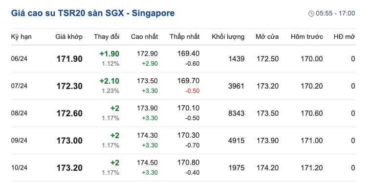 Cao su TSR20 giao dịch trên sàn SGX - Singapore từ 5h55 đến 18h00, giờ Việt Nam.