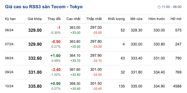 Cụ thể, giá cao su RSS3 hợp đồng kỳ hạn giao tháng 6/2024 ở mức 329,0 JPY/kg. Kỳ hạn giao hàng tháng 7/2024 là 329,9 JPY/kg. Kỳ hạn giao hàng tháng 8/2024 là 332,6 JPY/kg, tăng 0,48 %. Kỳ hạn giao hàng tháng 9/2024 là 331,0 JPY/tấn. Kỳ hạn giao hàng tháng 10/2024 là 335,8 JPY/kg, tăng 0,27%.