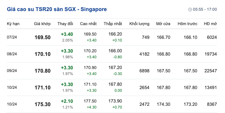 Theo đó, giá cao su giao kỳ hạn tháng 7/2024 tăng 2,05% lên mức 169,5 US cent/kg so với phiên mở cửa. Kỳ hạn giao hàng tháng 8/2024 là 170,1 US cent/kg, tăng 1,98 %. Kỳ hạn giao hàng tháng 9/2024 là 170,8 US cent/kg, tăng 1,97%. Kỳ hạn giao hàng tháng 10/2024 là 171,1 US cent/kg tăng 1,97%. Kỳ hạn giao hàng tháng 11/2024 là 175,3 US cent/kg tăng 1,21%.