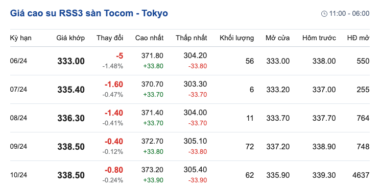 Cụ thể, giá cao su RSS3 hợp đồng kỳ hạn giao tháng 6/2024 ở mức 333,0 JPY/kg. Kỳ hạn giao hàng tháng 7/2024 là 335,4 JPY/kg. Kỳ hạn giao hàng tháng 8/2024 là 336,3 JPY/kg. Kỳ hạn giao hàng tháng 9/2024 là 338,5 JPY/tấn. Kỳ hạn giao hàng tháng 10/2024 là 338,5 JPY/kg.