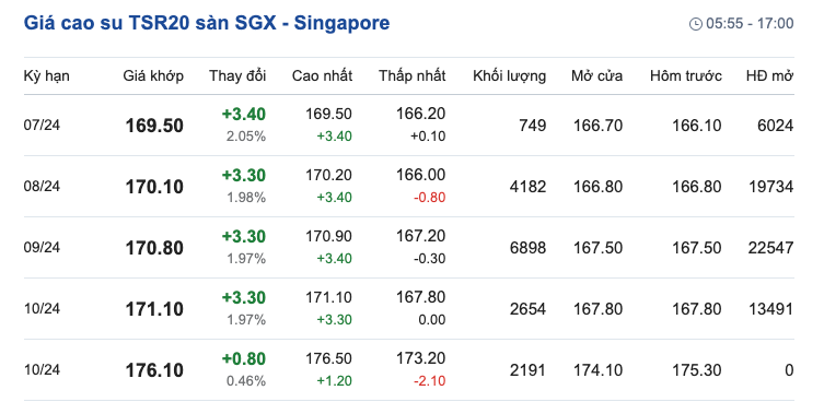Theo đó, giá cao su giao kỳ hạn tháng 7/2024 tăng 2,05% lên mức 169,5 US cent/kg so với phiên mở cửa. Kỳ hạn giao hàng tháng 8/2024 là 170,1 US cent/kg, tăng 1,98 %. Kỳ hạn giao hàng tháng 9/2024 là 170,8 US cent/kg, tăng 1,97%. Kỳ hạn giao hàng tháng 10/2024 là 171,1 US cent/kg tăng 1,97%. Kỳ hạn giao hàng tháng 11/2024 là 176,1 US cent/kg tăng 0,46%.