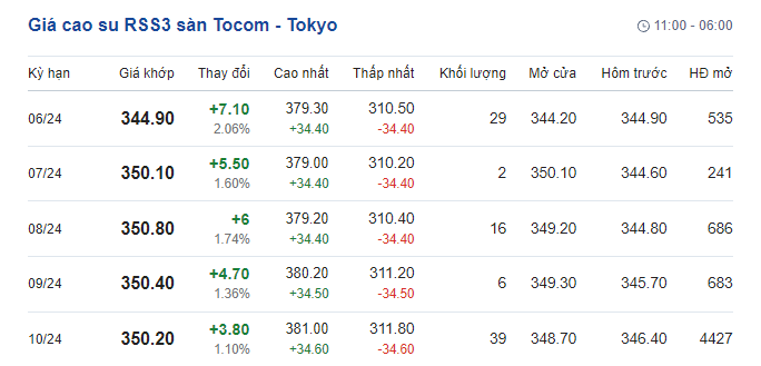 Cụ thể, giá cao su RSS3 hợp đồng kỳ hạn giao tháng 6/2024 ở mức 344.9 JPY/kg. Kỳ hạn giao hàng tháng 7/2024 là. 350.1 JPY/kg. Kỳ hạn giao hàng tháng 8/2024 là 350.8 JPY/kg. Kỳ hạn giao hàng tháng 9/2024 là 350.4 JPY/tấn. Kỳ hạn giao hàng tháng 10/2024 là 350.2 JPY/kg.