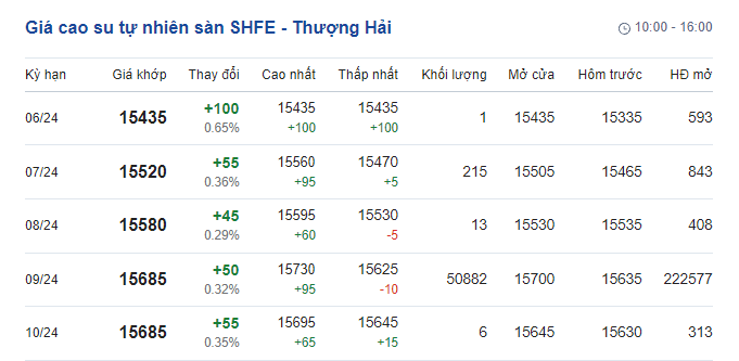 Cao su tự nhiên giao dịch trên sàn SHFE - Thượng Hải từ 10h00 đến 12h30, 13h30 đến 16h00, giờ Việt Nam.