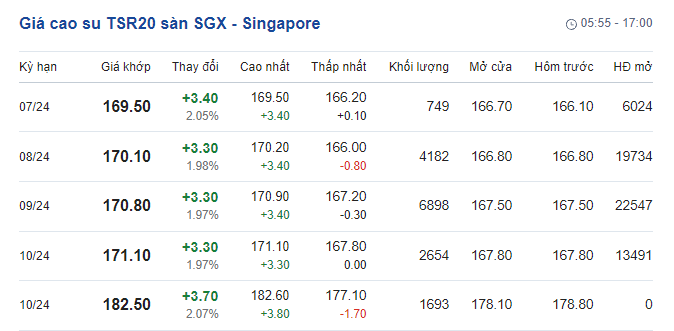 Theo đó, giá cao su giao kỳ hạn tháng 7/2024 tăng mạnh 2,05% lên mức 169,5 US cent/kg so với cuối phiên liền trước. Kỳ hạn giao hàng tháng 8/2024 là 170,10 US cent/kg, tăng 1,98%. Kỳ hạn giao hàng tháng 9/2024 là 170,8 US cent/kg, tăng 1,97%. Kỳ hạn giao hàng tháng 10/2024 là 171.1 US cent/kg tăng 1,97%. Kỳ hạn giao hàng tháng 11/2024 là 182,5 US cent/kg tăng 2,07%.