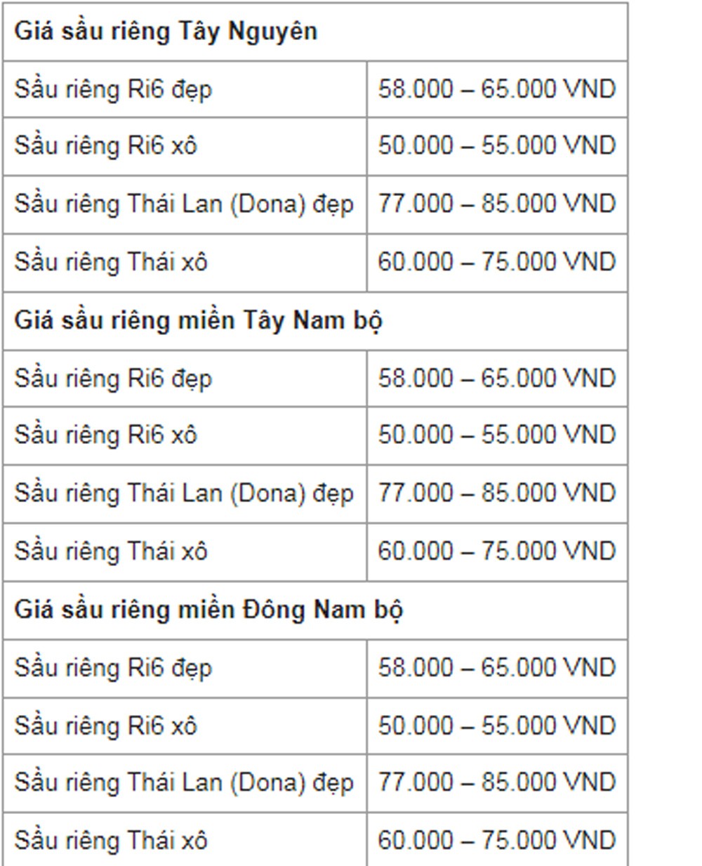 Giá sầu riêng tại khu vực Tây Nguyên: Giá sầu riêng Ri6 đẹp và sầu riêng Ri6 xô ở mức giá thương lái mua 48.000 – 67.000 đồng/kg; sầu riêng Thái đẹp có mức 83.000 - 85.000 đồng/kg; trong khi đó sầu riêng Thái xô ở mức 63.000 – 65.000 đồng/kg.